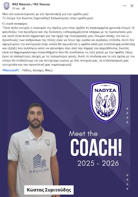 Τον καινούργιο της προπονητή ανακοίνωσε η ομάδα της Νάουσας, μετά την λύση της συνεργασίας με τον Γιάννη Κερλίδη.